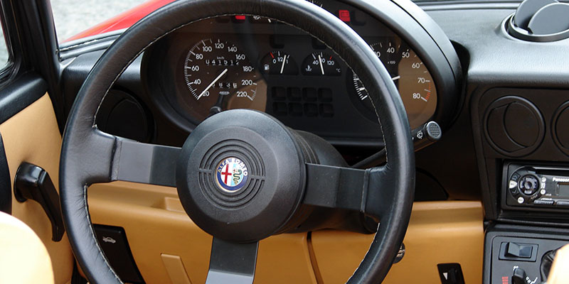 Depuis toujours, les moteurs Alfa Romeo sont (du moins étaient...) synonymes de sportivité et de plaisir de conduire. Lancé avec un 4 cylindres 1570 cm3 à quatre arbres à cames en tête de 109ch, le Spider adopte dès 1967 le moteur 1750 cm3 (Spider Veloce) complété par un petit 1290 cm3 (Spider 1300 Junior) de 89 ch en 1968. Après un passage au puis le 1779 cm3 de 118 ch à carburateurs, en 1971 le Spider devient 2000 Veloce et adopte un nouveau moteur plus puissant tout en aluminium de 1962 cm3, de type longue course, développant 128 ch en version carbu puis 126 avec l'injection Bosch Motronic à partir de 1991 (120 ch à partir de 1992 pour le modèle catalysé). Le "Cuore Sportivo" du Spider, c'est bien entendu ce moteur... ah, le "bialbero" (double arbres en italien) est un simple 4 cylindres mais ô combien attachant par son effet acoustique. Rauque et métallique, les harmoniques s'émancipent à travers une ligne d'achappement qui se livre sans se faire prier à quelques pétarades. Un régal ! L'alimentation et gestion électronique avec variateur de phase améliore son fonctionnement, mais on le sent réellement vivre avec son ralenti instable ce moteur ! Notons que la documentation commerciale fait état de 126 ch, à tord, car en réalité ce sont 130 chevaux d'un autre temps, qui animent notre version française. Une fois assimilé le mode d'emploi de la pédale d'embrayage réduite (très !), on sélance pour fendre l'air et en prendre "plein la tronche".