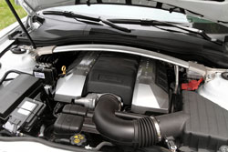 Pas de V6 pour l’Europe dans la Chevrolet Camaro. C’est V8 et rien d’autre ! Et pas n’importe lequel puisqu’il s’agit du récent LS3, spécialement conçu pour la Camaro justement et qu’elle partage avec la Corvette Grand Sport essayée en novembre dernier. Logé en position centrale avant, ce V8 6.2L marque une évolution assez importante par rapport à la première C6. Tout d'abord, le moteur diffère selon la boîte choisie : le LS3 est accouplé à la transmission manuelle et le L99 à la boite automatique. Pour l’essentiel les moteurs sont les mêmes avec deux différences notables : la version automatique est équipée de la désactivation des cylindres Active Fuel Management et du calage variable de la distribution (VVT).