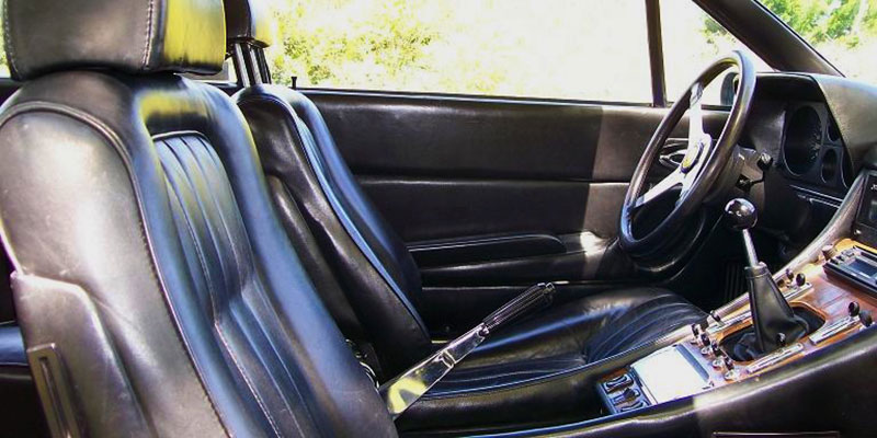 Dans l’habitacle, le bon et le moins bon cohabitent. L’imposante et très belle console centrale (en bois), ressemblant à ce que l’on peut trouver dans le coupé 365 GTC/4, regroupe plusieurs fonctions et levier de vitesses. Au-dessus de celui-ci, plusieurs indicateurs dont une horloge et la température d’huile prennent place. Dommage que le tableau de bord simpliste et les commodos ne soient pas dignes du standing de cette Ferrari 365 GT4/2+2.