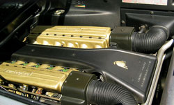 En soulevant le capot de la Lamborghini Diablo SE30, on découvre avec étonnement un haut moter fait de noir et de dorures, ce qui associé au violet de la carrosserie confine au plus pur kitsch ! Mais qu'importe, le principal est ailleurs. Le V12 5.7 de la première Diablo développait 492 ch, ce sont 525 ch qui se bousculent au bout des 7000 tours pour dévaster les deux roues arrière motrices. Contrairement à la Diablo VT, la SE30 demeure en effet une authentique sportive en propulsion. L'échappement a pour l'occasion été complètement revisité (comprenez largement libéré !) et le collecteur d'admission est en magnésium. Avec le gain de poids, le sperformances de la Diablo SE sont démoniaques : 0-100 Km/h en 4 secondeset une vitesse de pointe de 331 Km/h !