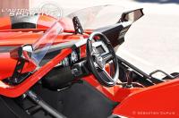 Pas de porte, pas de capote et un demi pare-brise en guise de saute-vent (de série sur la finition SL), l'habitacle du Slingshot se révèle des plus faciles d'accès ! Alors qu'il faut se contorsionner en posant les mains au bon endroit pour entrer dans une Seven et faire le grand écart au-dessus d'un longeron monumental pour s'insérer dans une Elise, il n'y a ici qu'à enjamber le petit tube qui sépare le siège de la route pour passer au volant. De premier abord, ce siège interloque, avec son revêtement granuleux il donne l'impression d'être en plastique rigide et laisse craindre un confort digne du banc d'église ! Mais ce n'est qu'illusion, le postérieur y étant finalement accueilli en souplesse. Plutôt bien calé, on ne trouve pas de réglages superflus mais le volant tombe assez naturellement en main. Bien qu'un peu décalé, le pédalier est lui aussi bien agencé.
