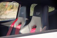 Le parc presse Renault a pris la même configuration extérieure que le modèle détenteur du record : peinture métallisée Spéciale (bi-ton Blanc Nacré / Toit Noir étoilé à 1.600 euros), strippings et damiers filaires latéraux et jantes 19’’ Speedline Turini rouges (couleur optionnelle). Avec ses peintures de guerre, la Mégane ne fait pas dans la dentelle. Impossible de passer inaperçu ! Il faut quand même bien insister sur le fait qu’il est possible d’avoir une carrosserie plus passe-partout. La lame avant F1 est reprise de la Trophy 275, avec cette fois un bandeau Trophy-R. C’est un avis purement personnel mais je préférais le R26-R écrit à l’envers, pensé pour être lu à l’endroit par le conducteur qui vous précède. A moins que Renault estime que personne ne puisse être devant la Trophy R...