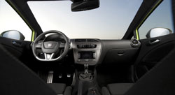 Dans l'habitacle, on est accueilli par d’excellents sièges baquets Corbeau recouvert en leur centre d’un cuir matelassé. La position de conduite est toujours parfaite par des réglages multiples en tout genre. Profitant du facelift 2009, la Cupra R est donc d’emblée dotée de la planche de bord réhabillée pour faire plus cossue. L’instrumentation reste toujours un peu pauvre de série. Véritable bonne affaire, la Leon Cupra R offre la totale en équipements de série : nouveau système de navigation désormais composé d'un ensemble radio et navigateur avec écran tactile, fonction Integral Parking Pilot, fonction Optical Park System, qui affiche à l'écran une représentation visuelle des obstacles entourant le véhicule, en complément des avertisseurs sonores. Outre les éléments déjà mentionnés, l'équipement de série de la Leon Cupra R intègre également les éléments suivants : indicateur de perte de pression des pneus, phares antibrouillard avec fonction éclairage statique de virage (Cornering), ordinateur de bord, radio CD + MP3 + huit haut-parleurs + Aux-in, installation combinée port USB + Aux-in et vitres teintées, entre autres. Heu… dites, et le sport dans tout ça ? Pas de « gadgets » comme le RS Monitor de Renault pour les pilotes en herbe ? Dommage étant donné que Seat s'adresse avant tout à une clientèle jeune et adepte de ce genre de petit "plus" …