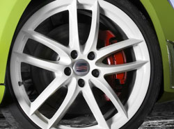 Impossible de passer à côté de la Leon 2 Cupra R sans la remarquer ! Avec sa ligne quelque peu « monospacisée », l’Ibérique semble avoir mis la panoplie complète de la sportive : grosses aérations dans le bouclier avant, échappement sport, rétros noirs, becquet de toit, jantes de 19 pouces de série (c’est la seule à le proposer) qui peuvent être blanches en option gratuite… Ajoutez à cela le léger facelift qui modifie essentiellement (et légèrement !) la calandre et les optiques et des teintes qui parfois acidulées, comme le vert de notre modèle de présentation, et la Cupra R fait sa petite impression. Avec les jantes blanches, le contraste avec les étriers peints en rouge n'en est que plus visible.