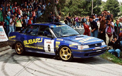En 1990 Subaru engage la Legacy RS en WRC par le biais du préparateur anglais Prodrive. Engagée pour la première fois sur le Safari Rally, la Legacy montre des rapidement des problèmes sur la transmission et le moteur. 3 ans plus tard, la voiture n'a toujours aucune victoire à son palmarès. En 1993, la Legacy est fortement menacée par sa nouvelle petite sœur: l'Impreza, sur laquelle Prodrive commence déjà à travailler. Mais Subaru persiste avec la Legacy et c'est au rallye de Nouvelle Zélande qu'elle signe enfin sa première victoire avec Colin McRae (ici en photo au Tour de Corse) ! L'année suivante, c'est le commencement d'une nouvelle ère pour Subaru qui imposera son Impreza "555" groupe A, puis l'Impreza WRC à partir de 1997 sur toutes les épreuves.