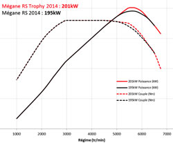 Avec 25 chevaux et 44 Nm de plus que la Mégane, la STI dispose de meilleures performances malgré un poids supérieur. C'est surtout sur le 0 à 100 km/h, où la motricité offerte par la transmission intégrale, que la Subaru creuse l'écart avec un temps de 5,2 secondes contre 6 secondes pour la Trophy 275. Les 10 chevaux grappillés par cette nouvelle Trophy ne font que très peu évoluer les performances officielles de la Mégane par rapport à la RS 265. Le gain est obtenu à haut régime où le F4RT est vif et rageur jusqu’à 6.800 tr/min. En face, le Flat4 est très brutal mais s’essouffle trop vite. Il affiche même un léger creux à bas régime que l’on ne ressent pas sur la française. Dans le flot de la circulation, les performances et reprises semblent plus serrées. Au final, avec un même rapport poids/puissance (5 kg/ch) deux mentalités s'opposent : allonge d'un côté et brutalité de l'autre.