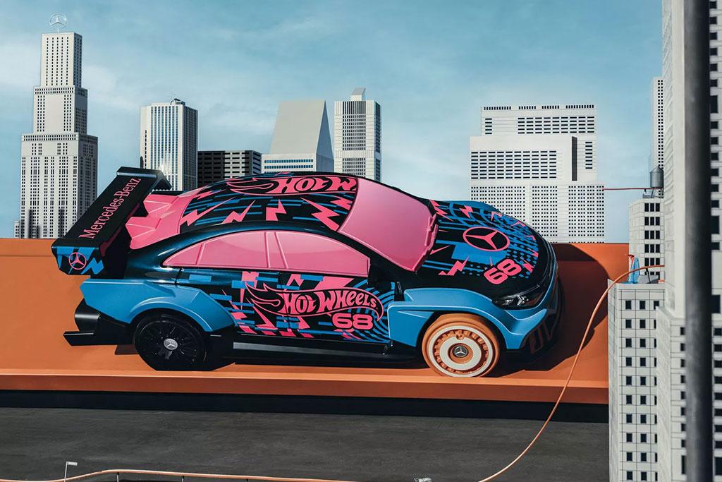 La Mercedes CLA a ainsi été revisitée à sauce la Hot Wheels, grand spécialiste des voitures miniatures moulées sous pression aux décos souvent flashy. Des vitres roses, un kit carrosserie élargi, un diffuseur massif, un aileron arrière imposant, des jantes dépareillées et une livrée colorée avec des flammes surdimensionnées rappelant la culture pop des années 1980 transfigurent effectivement la très statutaire CLA en un bolide de course ludique à l'échelle 1.