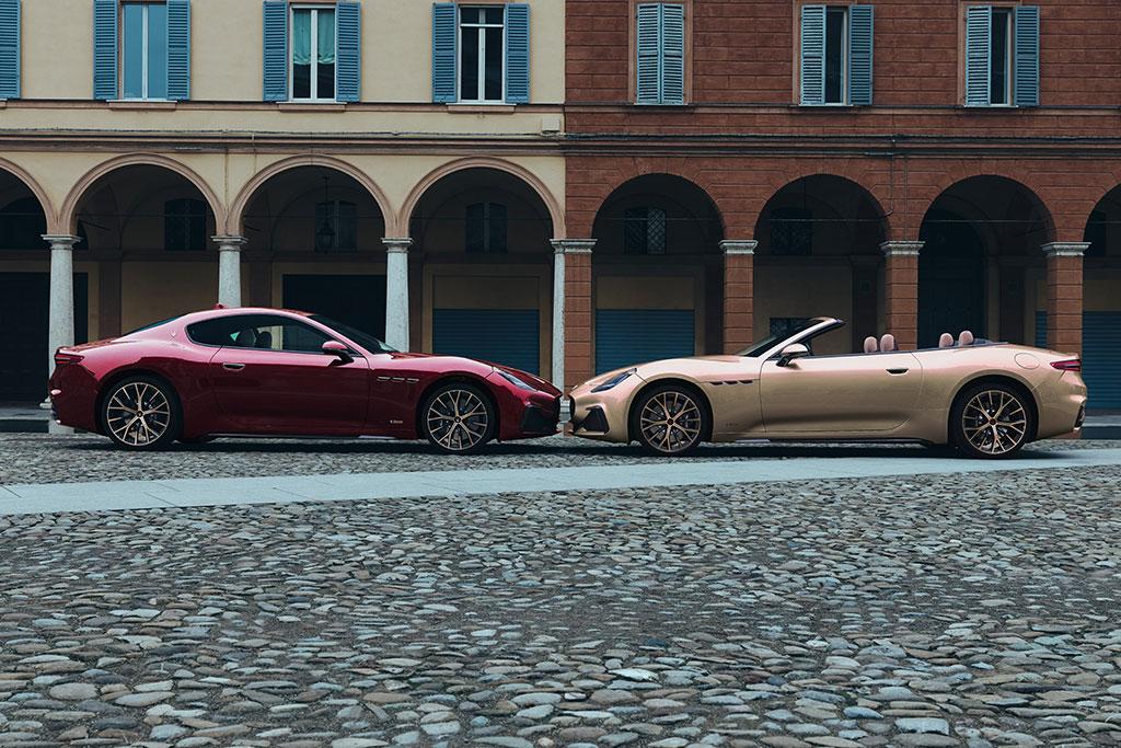 Chaque élément extérieur a été repensé comme les jantes CRIO 21 pouces noires avec inserts diamantés en Clearcoat Pale Gold finition mate, les badges et inscriptions moteur en White Gold Matte pour la GranTurismo (Rosso Velluto) et en Rosso Velluto Matte pour la GranCabrio (Oro Lirico), le Trident de la calandre, intégré au radar ADAS, adopte une finition or, symbole d’opulence et de tradition. La GranTurismo arbore des badges White Gold Matte contrastant avec la carrosserie rouge, tandis que la GranCabrio joue sur l’harmonie entre Oro Lirico, Rosso Velluto et finitions dorées.