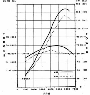 Décliné en trois cylindrées - 1991 cm3 (alésage de 80mm et course de 66mm), 2394 cm3 (alésage de 84mm et course de 72mm) de 188 ch (réservé au marché Thailandais) et 2494 cm3 (alésage de 84mm et course de 75mm) - le L6 M50 conserve un bloc en fonte et une culasse en alliage mais présente de nombreuses évolutions techniques par rapport au M20. On citera notamment la culasse à quatre soupapes par cylindre, les poussoirs avec rattrapage hydraulique du jeu des soupapes et un système d'admission en matière plastique qui constitua une première mondiale avec son procédé de moulage dit "à noyaux perdus". Autre nouveauté inédite sur le L6, l'allumage à "distribution statique" faisant appel à une bobine individuelle pour chaque cylindre comme sur le V12 M70. Enfin, le M50 fait de nouveau appel à une chaîne de distribution. Sur le graphique ci-contre, on peut mesurer le gain entre le M50B25 (192 ch) et le M20B25 (170 ch).